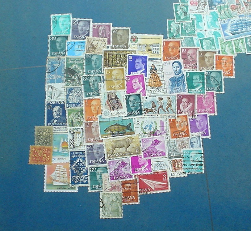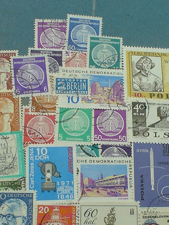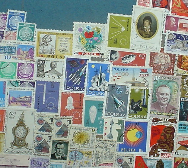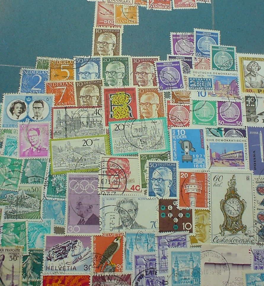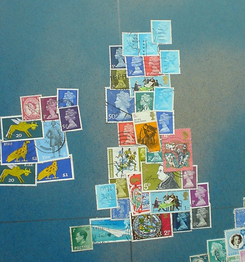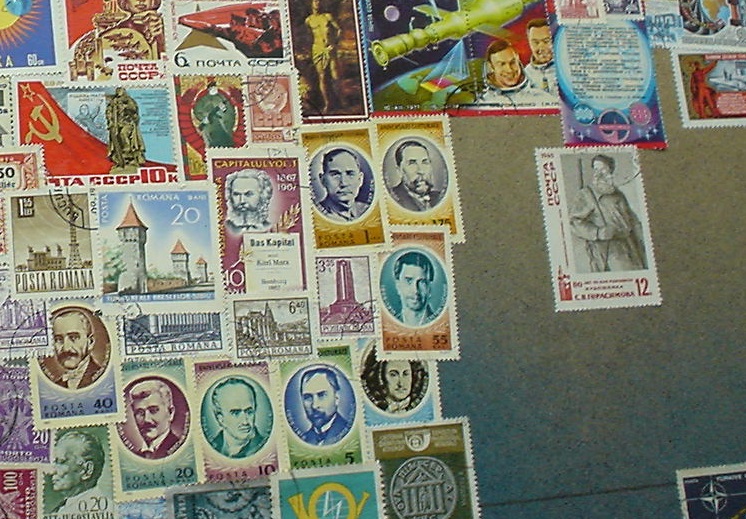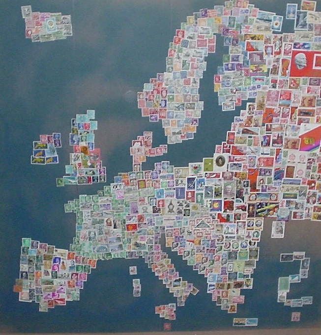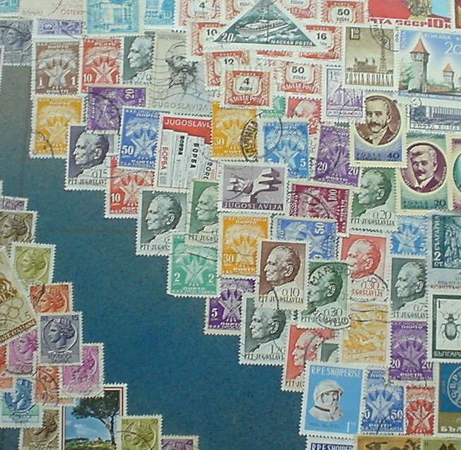 * Von der riesigen Sowjetunion findet sich auf der Karte nur der europäische Teil (bis etwa zum Ural-Gebirge, was in Nord-Süd-Richtung verläuft). Für diesen Teil sind vorwiegend Marken in roter Farbe verwendet worden (da gab es grosse Auswahl :-).