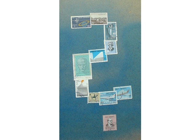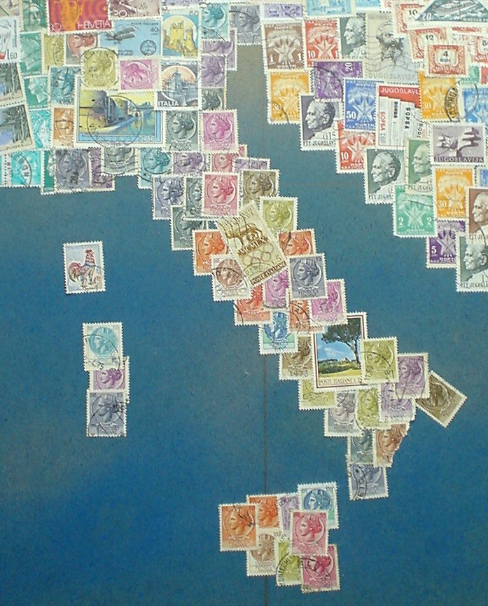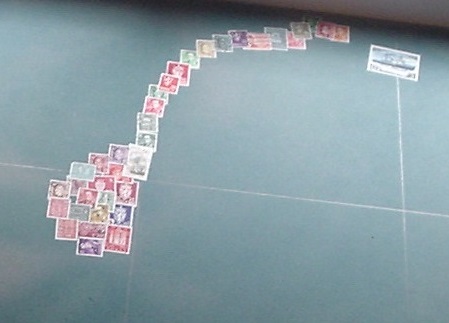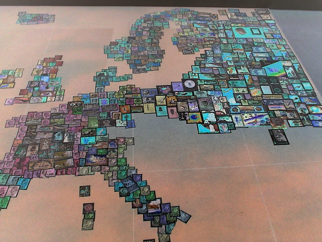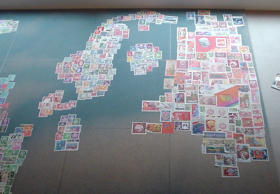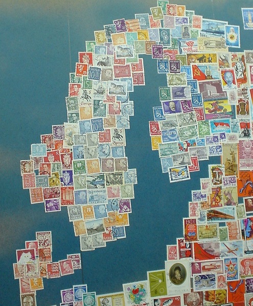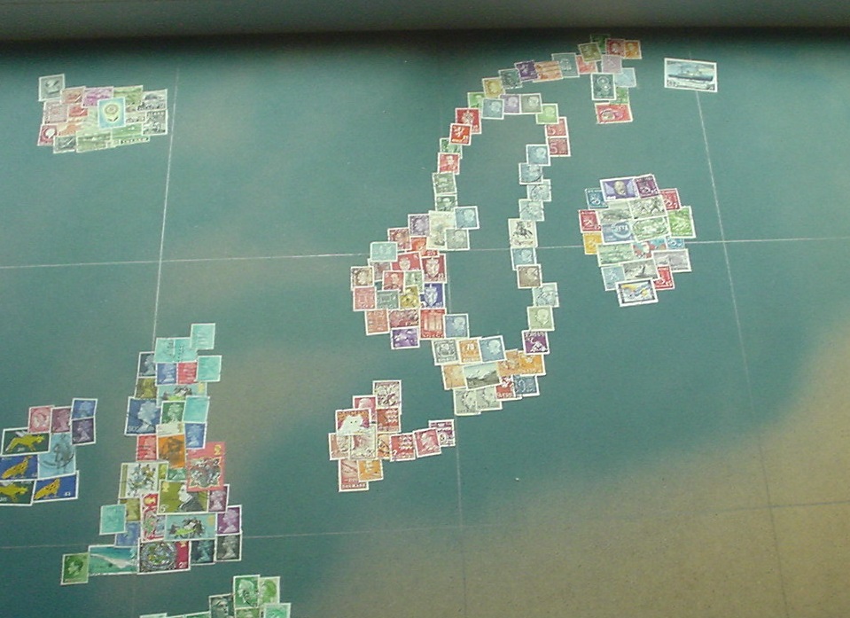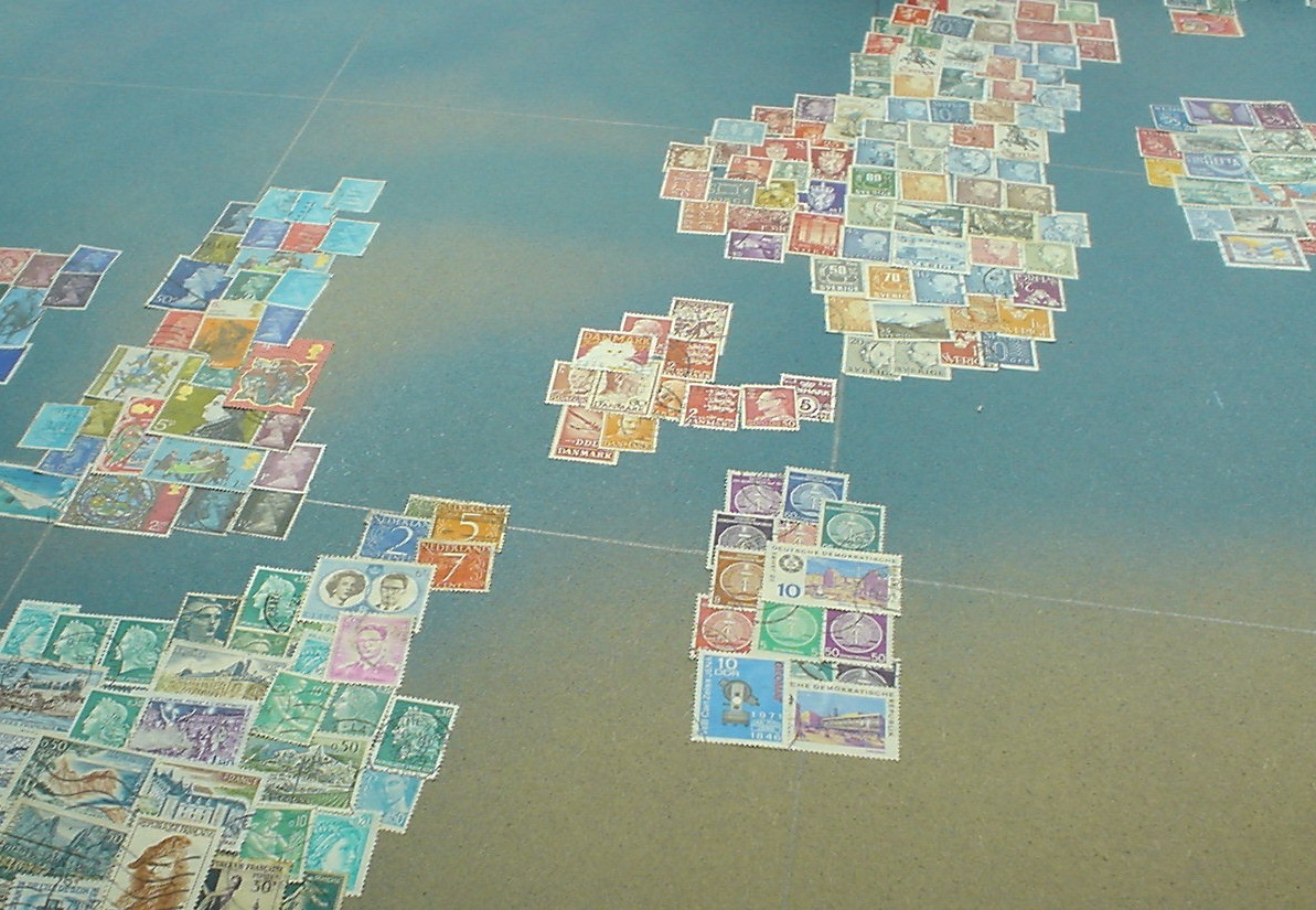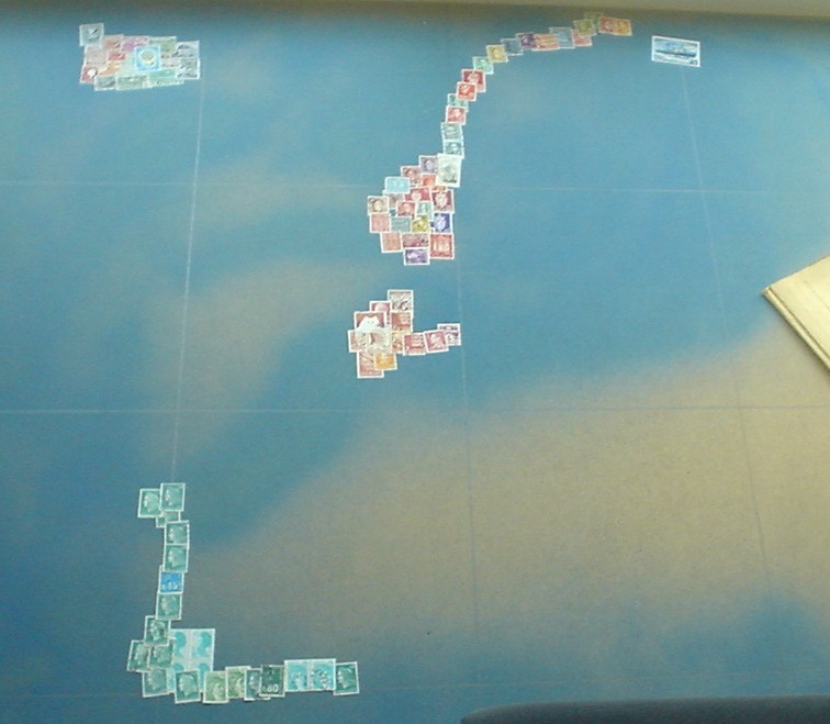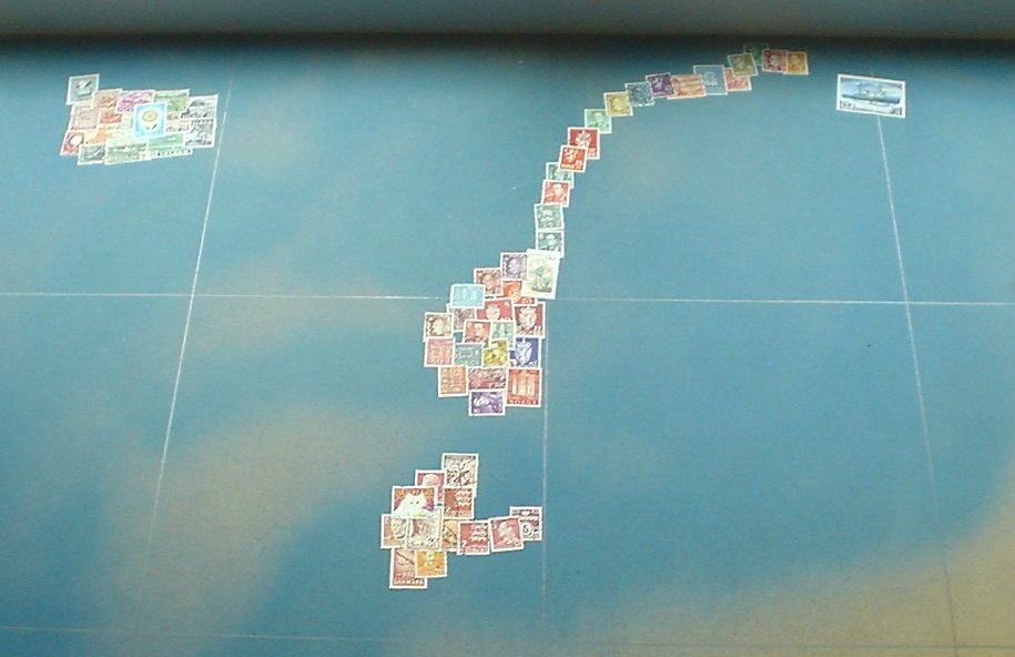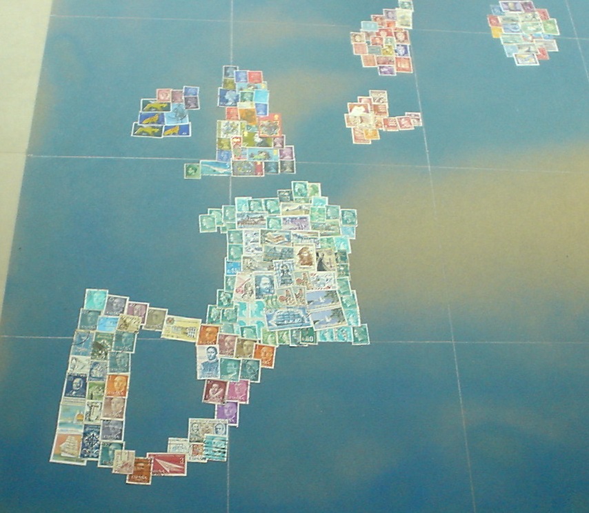 In der Karte ist jedes Land durch Briefmarken aus diesem Land repräsentiert. Die Karte ist etwa 1 Meter x 1 Meter gross. Die Platte ist aus Sperrholz. Wir haben sie zuerst mit blauer Acrylfarbe (nicht ganz deckend) besprüht. Die Marken sind dann mit einem Klebestift fixiert.