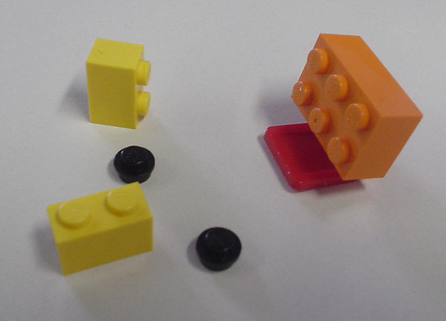 zwei gelbe 2x1-Steine, zwei schwarze runde 1x1-Plättchen und eine rote