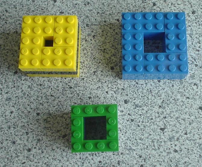 When one requires that in addition each layer of the hole consists of only four bricks then only a few possibilities remain. The photo shows three standard solutions: the yellow one with 3x2-bricks and hole width 1x1; 3x1-bricks and hole width 2x2; 4x2-bricks and hole width 2x2.