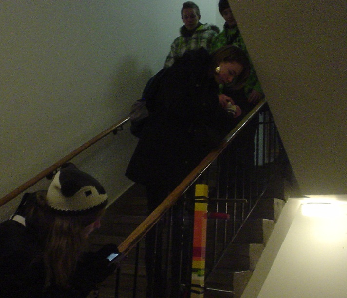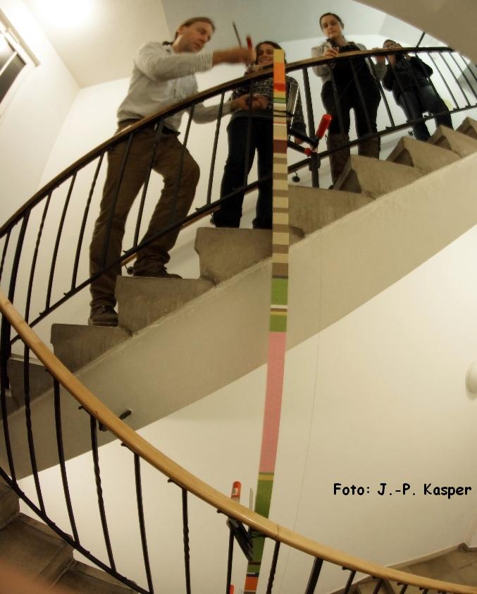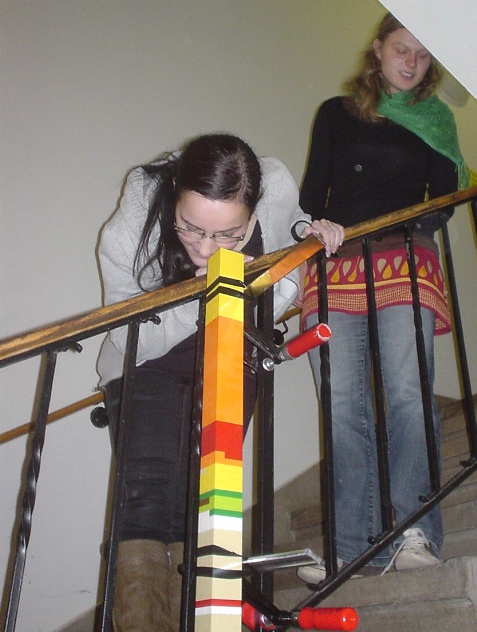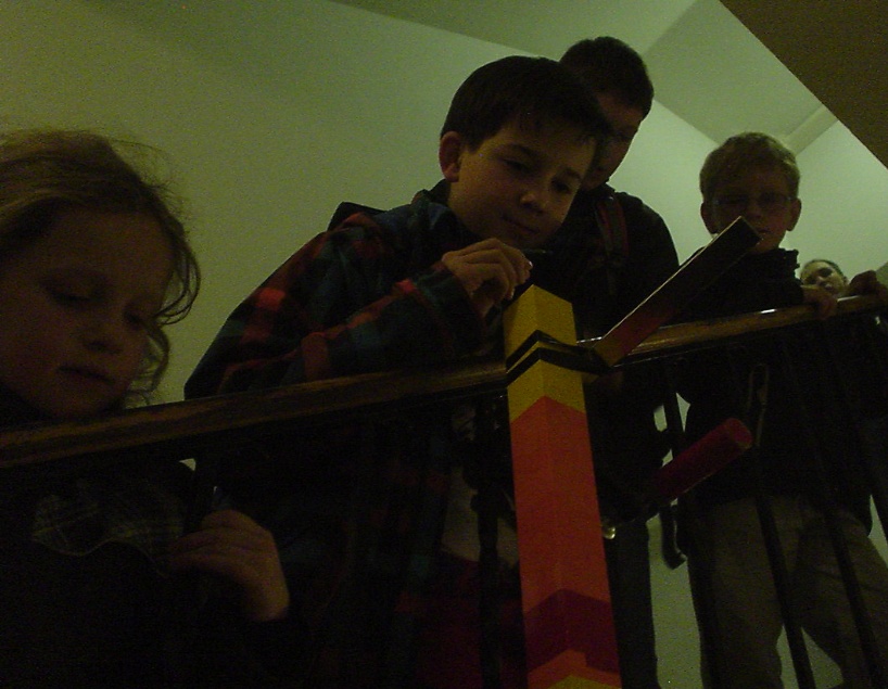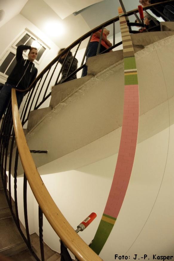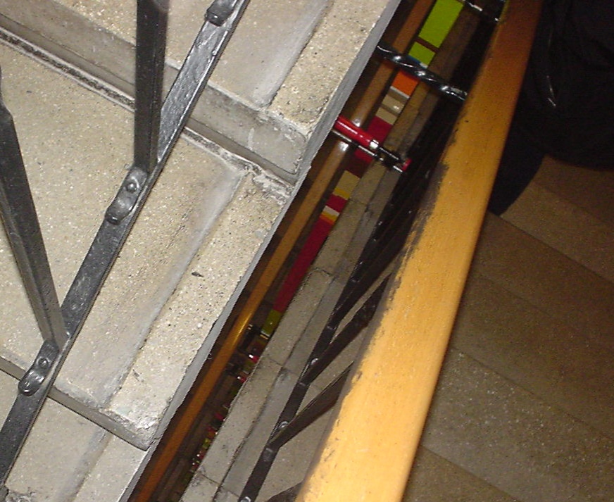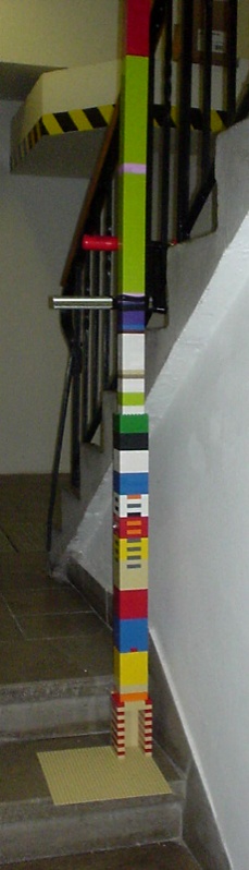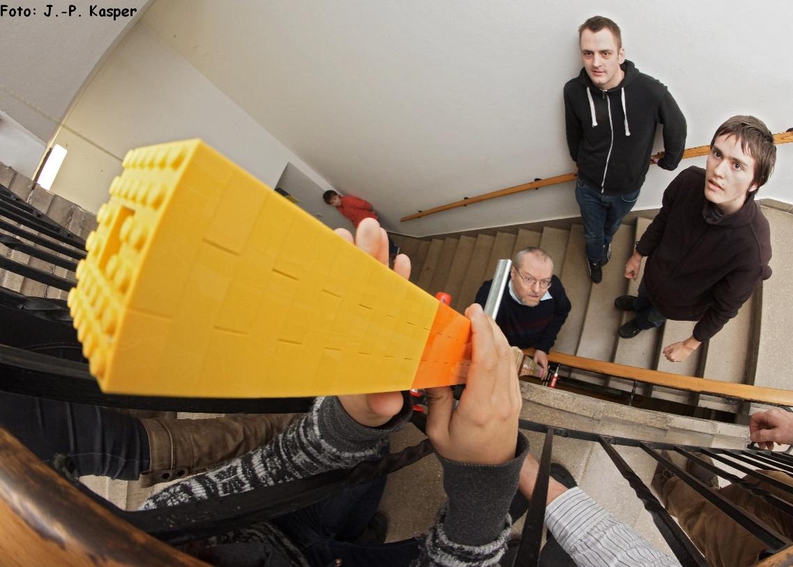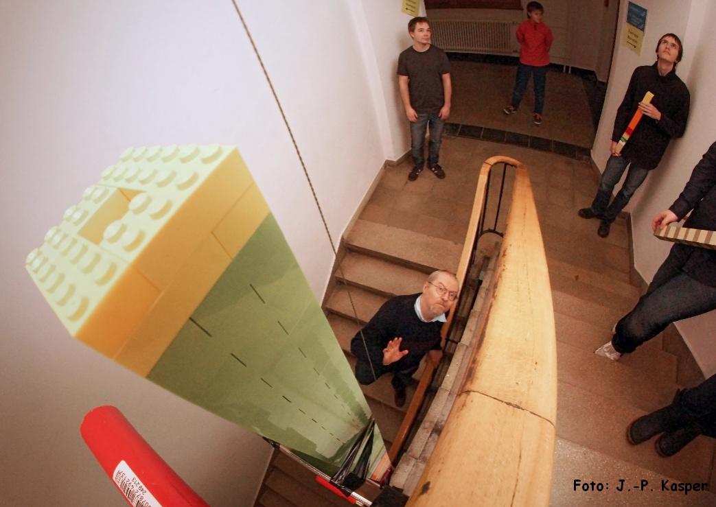 At this moment of this photo the hole was not finished, yet. Anyhow, we had passed already the 10 meter mark. The string of the plummet can be seen which was for our orientiation. You also see two of the twelf clips (with the red grips) fixed at the banisters: they stabilized the hole via black adhesive tape. On the stairs some helping students are waiting with further segments for the Lego hole. We had prepared the segments in the months and weeks before the event; each one consisted of 60 (or 58 or 62) layers of Lego bricks.