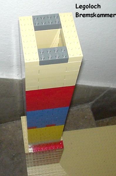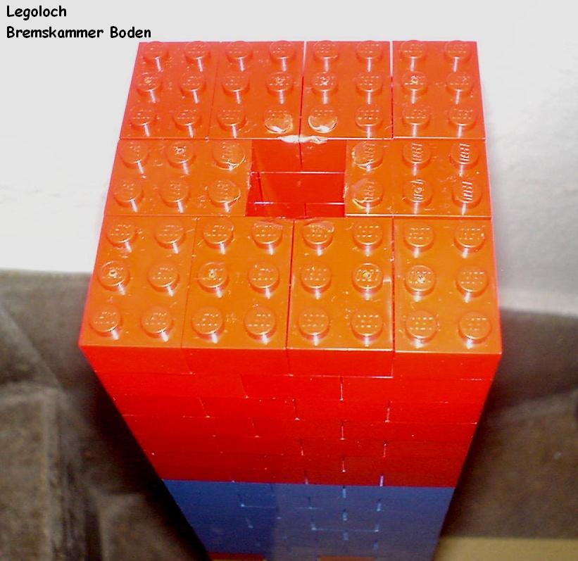 The hole was not one hundred percent vertical and had several small bulges. This meant that the ball typically beat at the inside walls several times during its "journey". About 60 centimeters above ground we had widened the hole, from 2x2 to 4x4 pins. Almost always the ball used the extra space. When the hole narrowed back to 2x2 some 30 centimeters later the still fast ball typically missed this small exit. Instead, it crashed on the edge which reduced its speed to almost zero. Then it slid down in the hole, arriving slowly and without danger at the absolute bottom. Of course, sometimes the ball hit the narrow 2x2-hole directly leading to an impressive impact at the ground. This happened in about five percent of the cases. So, our brake chamber construction was not idiot-safe...