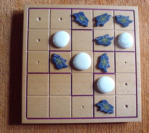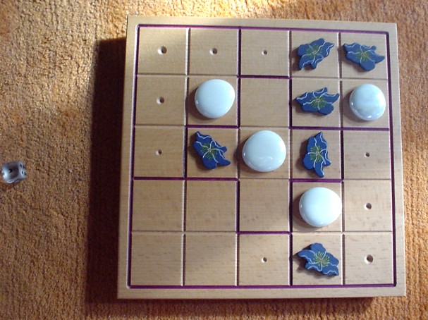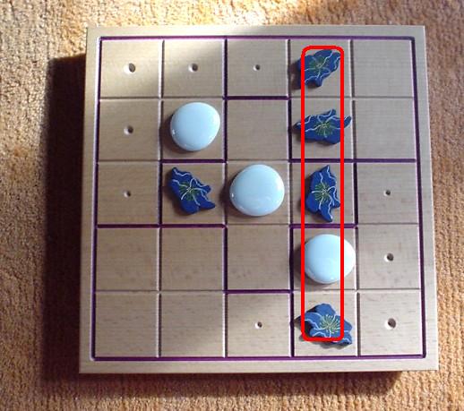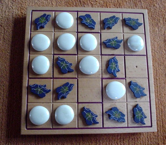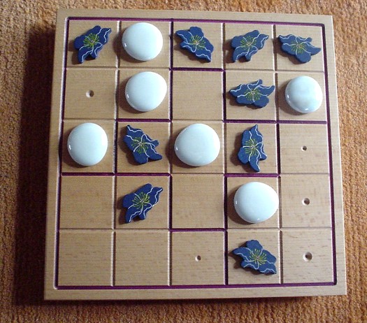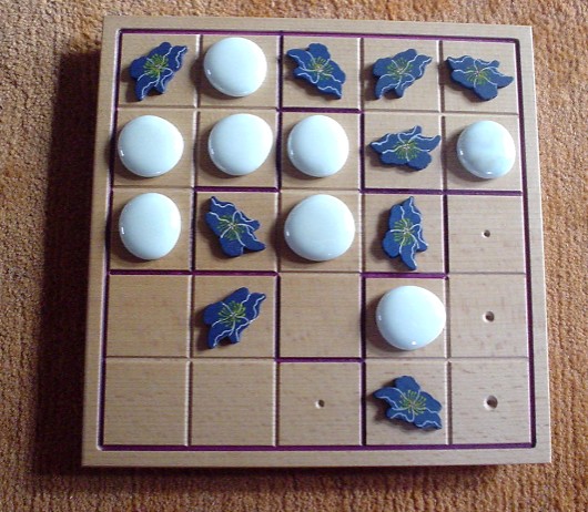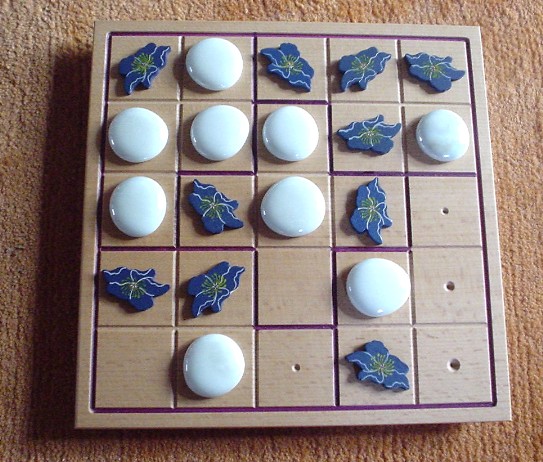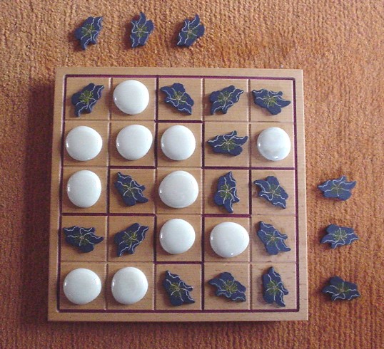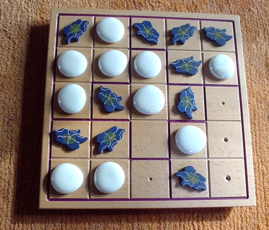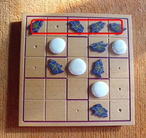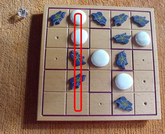 When all squares of the board are filled (after 25 moves), for each group it is determined whether it is balanced or unbalanced. A group is balanced when it contains two or three blue pieces (and three or two white pieces, correspondingly). When the blue-white relation is 5-0 or 4-1 or 1-4 or 0-5, this group is unbalanced.